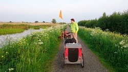 We fietsen een stukje door Hitland en laten meteen woef even uit. Ook S. heeft geen problemen met de tassen voorop de fiets en achterop. In de achtertassen op zijn fiets moet zeer zeker nog wat meer want we hebben nog weinig kleding in de tassen. Maar daar is dus nog ruimte voor.