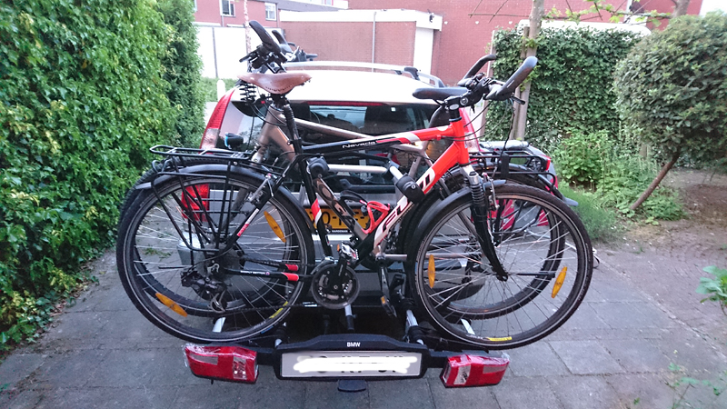 Als we thuis zijn, gaan we de fietsen op de nieuwe fietsdrager zetten en alles instellen. Dat blijkt geen lastig klusje te zijn en ik kan heel makkelijk zelf de drager op de auto zetten en alles verder laden. De drager is kantelbaar zodat de hond er nog uit kan als de fietsen er al opzitten.